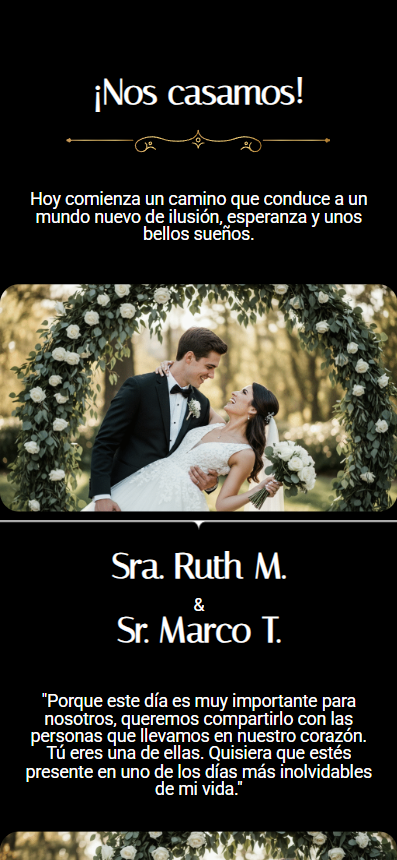 Nosotros recibimos el pedido, diseñamos la invitación y te la compartimos. Solo la pagas si es lo que esperabas. No queremos que pagues por una invitación que no te ha gustado.